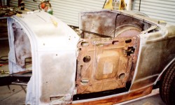 When Dave purchased this project in 1999 he didn’t mind that it was in such rough condition because he had every intention of building a rat rod. This project car was found at a San Diego swap meet and the previous owner didn’t offer much background on the vehicle. Dave thinks the majority of it’s life was spent as a driver as the car still had evidence of fresh oil leaks. The quarter panels and floor had been patched once in it’s history but were rusted through again. They didn’t represent a problem as all would be replaced in Dave’s plan for this project. He decided to use a frame design similar to his 34′ Ford 3 window coupe to give his roadster the long, low look that he was after.Dave altered the roadster’s original frame by cutting off the frame rails at the firewall and fabricated a new set with an upward curve that creates the lower stance. The rails were also cut off at the rear wheel openings and replaced with a new rear section that was narrowed and raised for more tire and rear end clearance. Dave’s frame design on his roadster is now being reproduced for sale.