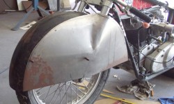 Modifications and changes happen on a regular basis in the pursuit of speed. One of the most recent riding changes is removing one tank. It doesn’t look as pretty but allows the rider to tuck in as low as possible. We also have a growing shelf of parts given up to Burt Monro’s “God of Speed!”