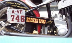 Dreams of Bonneville still didn’t happen until many years later. The initial test run was shortly after it was purchased in ’94 and it’s first run down the salt didn’t happen until 2004. The years in between had the Indian traveling in the back of a Broken Spoke semi being taken to motorcycle rallies across the United States. It didn’t reach Iversen’s California shop until late 2003 and Dave finally got started on doing some serious research and work on getting it ready to race. He took the bike for it’s first race in ’04 at El Mirage in Southern Ca. It passed technical inspection and made it’s debut run in the A-VG class. The 11 year old record was 126.760 mph and their first trip down the lakebed was a disappointing 71 mph…the magneto failed. Since that time the bike has been within 3mph of capturing that record.